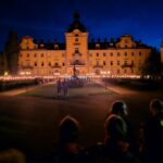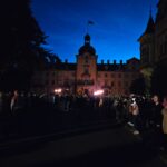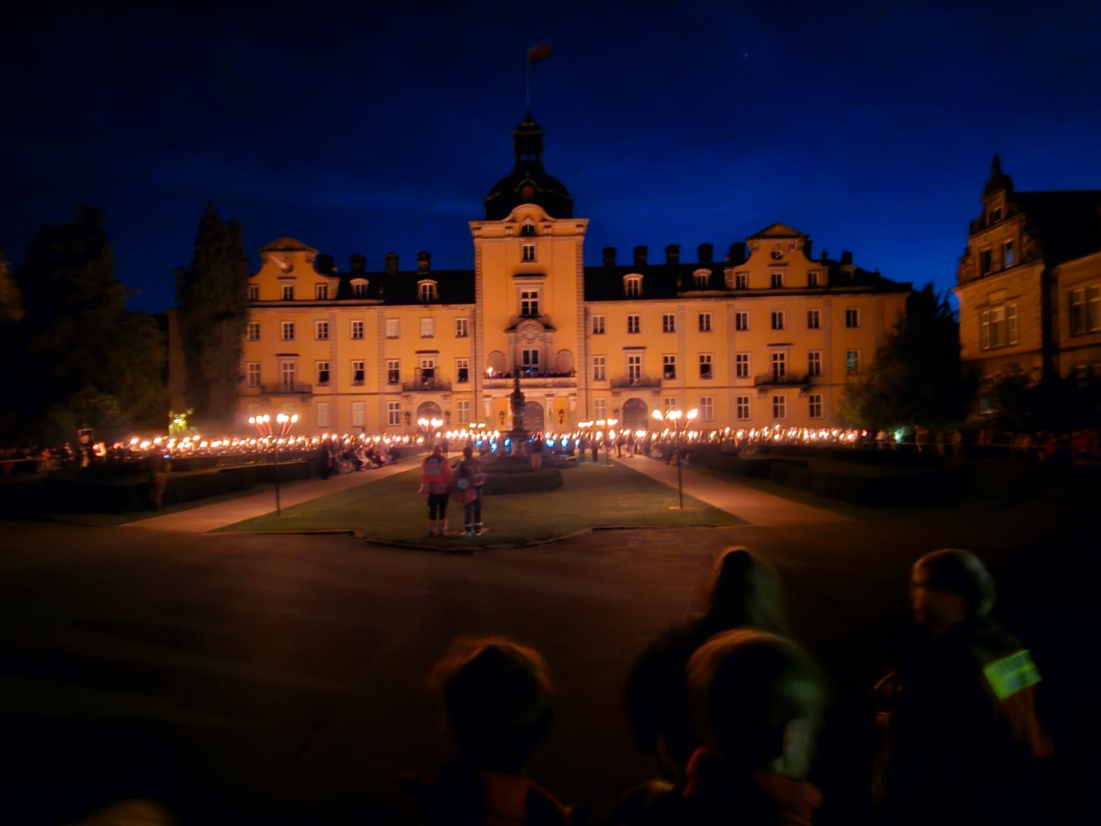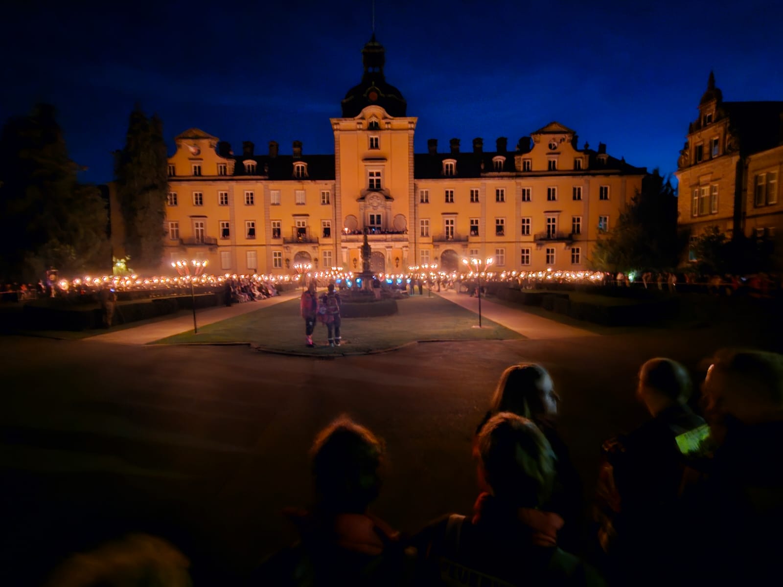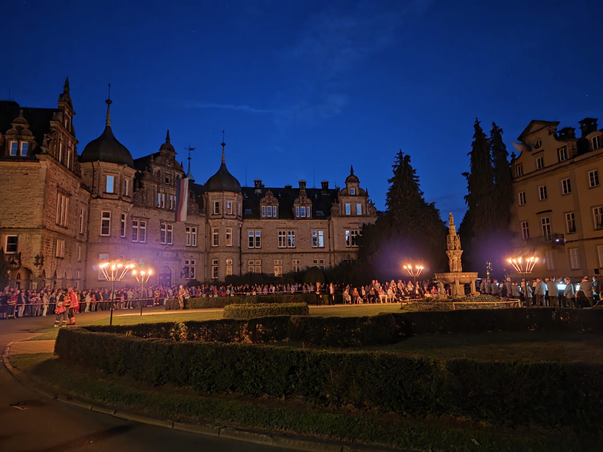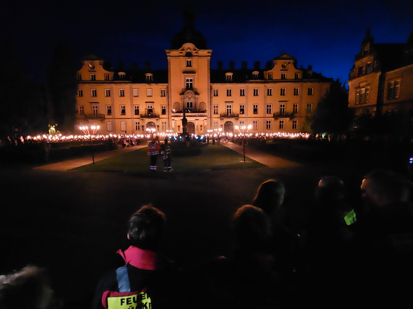 Am Freitagabend rückte schließlich eine Delegation von elf Frauen zum offiziellen Programm aus. Zunächst nahmen wir am öffentlichen Gottesdienst auf dem Marktplatz teil, bevor wir beim feierlichen Zapfenstreich mitmarschierten. Ausgestattet mit Fackeln reihten wir uns in Dreierformation direkt hinter den frisch vereidigten Soldaten der Bundeswehr ein und begleiteten den Zug in den Schlosshof des Bückeburger Schlosses.