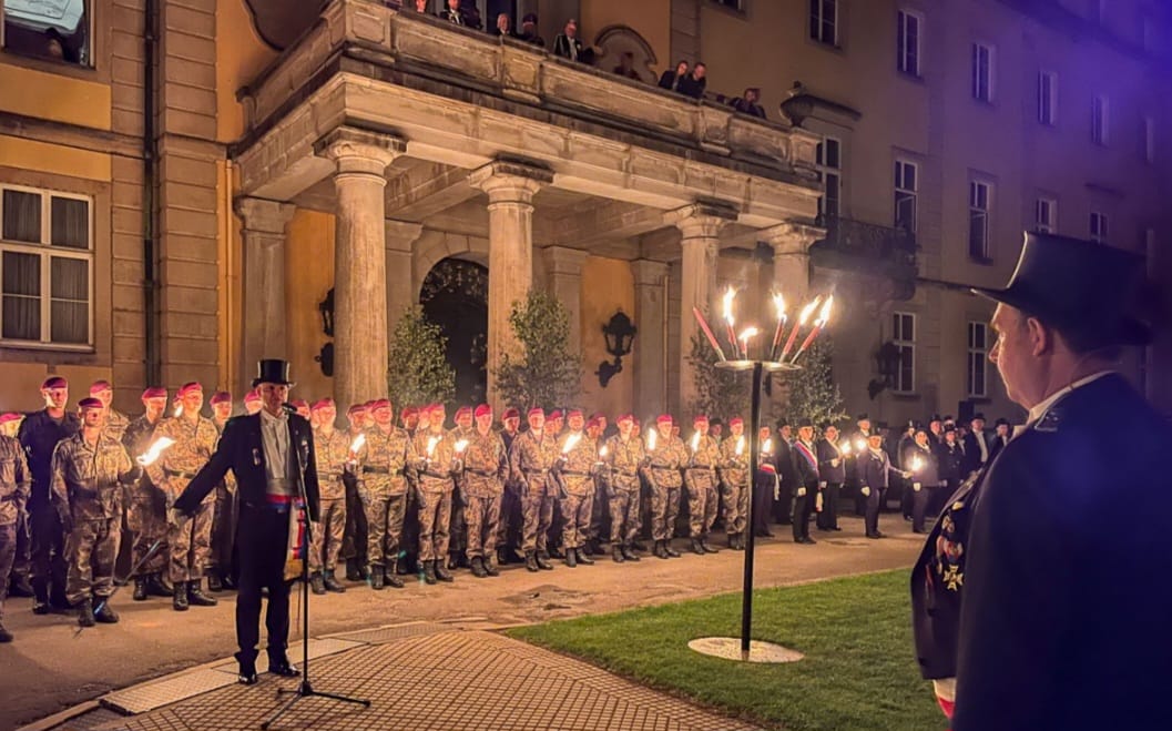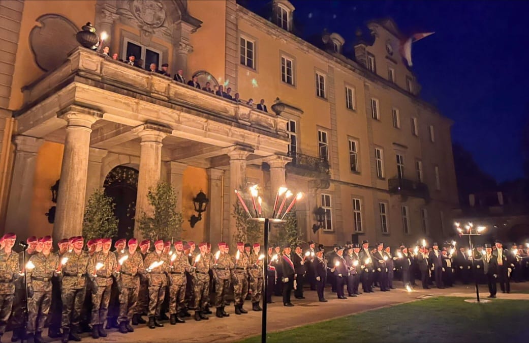 Nach dem großen Zapfenstreich führte der Marsch über den Reitweg und die Schulstraße zurück zum Marktplatz. Dort stellte sich die Formation erneut vor dem Rathaus auf, wo der eindrucksvolle Abend seinen offiziellen Abschluss fand.